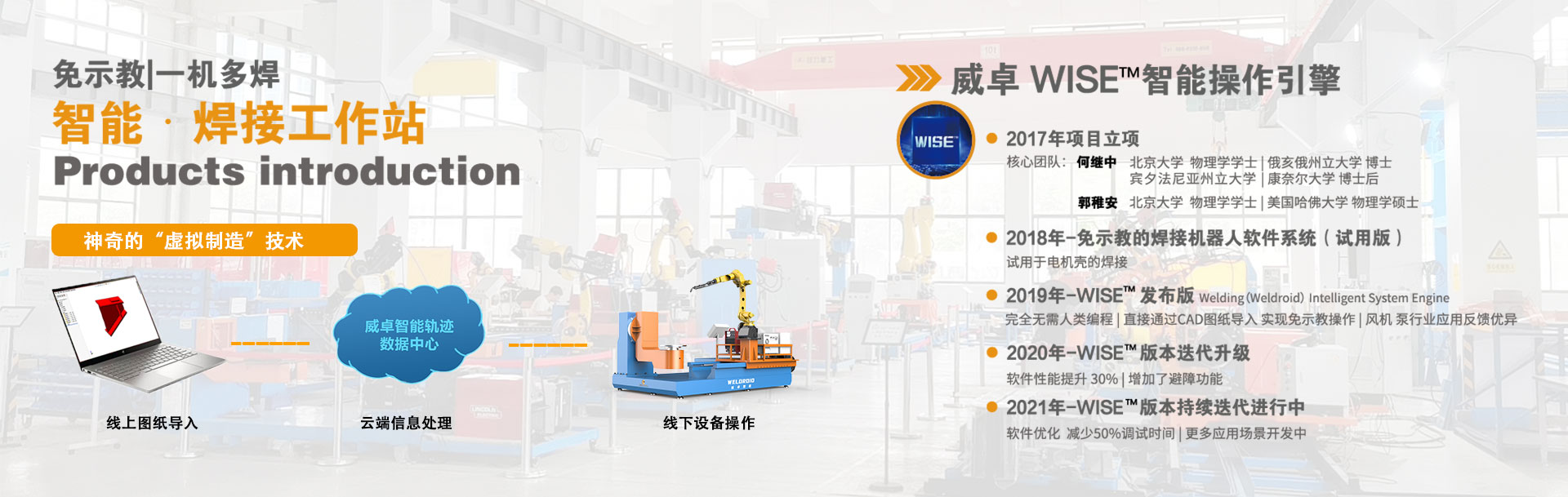 威卓專注于智能全自動焊接機器人這個新興的市場,擁有完整的核心技術 和知識產(chǎn)權,通過傳感器和軟件技術對普通焊接機器人進行智能化, 實現(xiàn)替代人工,降低生產(chǎn)成本,提高焊接質量的目標。